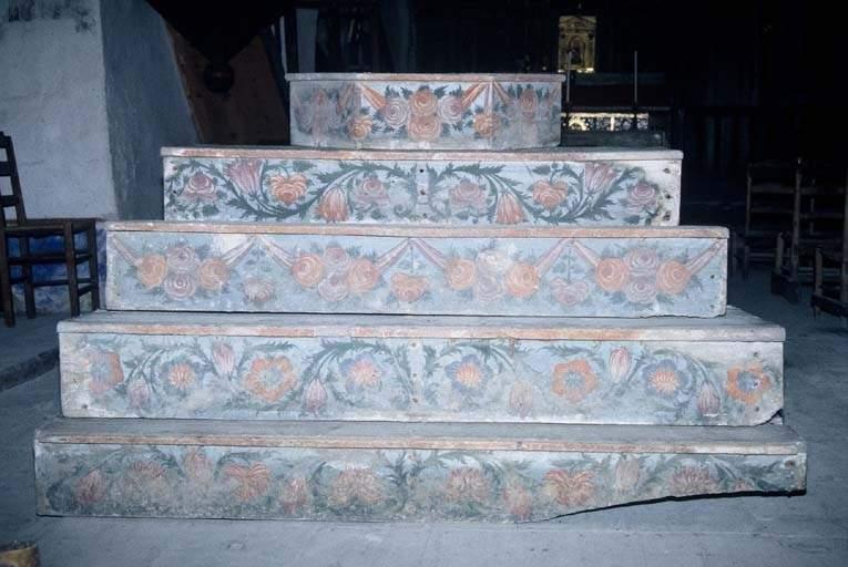 L'escalier du reposoir est composé de cinq éléments. Les quatre marches sont constituées d'un plateau, de deux côtés et d'une face, laquelle est peinte à la détrempe avec des motifs de rinceaux de feuilles (bleu-vert) et de fleurs (rouge orangé) sur fond bleu pâle. A l'arrière, les quatre premières marches disposent de pieds destinés à reposer sur le sol ; l'avant prend appui sur la marche antérieure. Les trois premières marches disposent chacune de deux mortaises, à l'arrière, destinées à recevoir des tenons provenant du côté intérieur des châssis des pans latéraux du décor peint.£L'élément sommital, avec trois faces peintes, devait reposer sur la table d'autel et servait à installer le Saint-Sacrement.