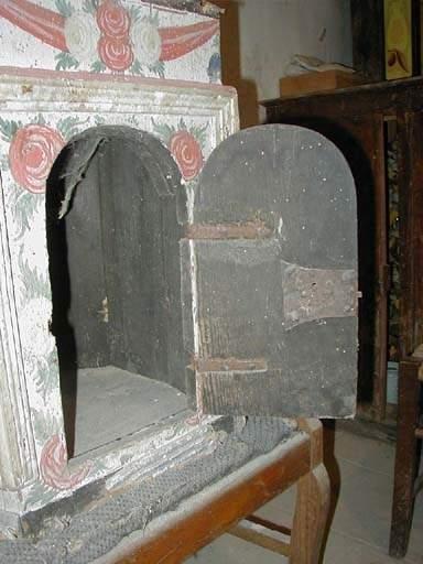 Tabernacle du 18e siècle retrouvé au revers du maître-autel avec les éléments de monuments du jeudi Saint. Son décor peint est assorti à celui de l'escalier du reposoir.