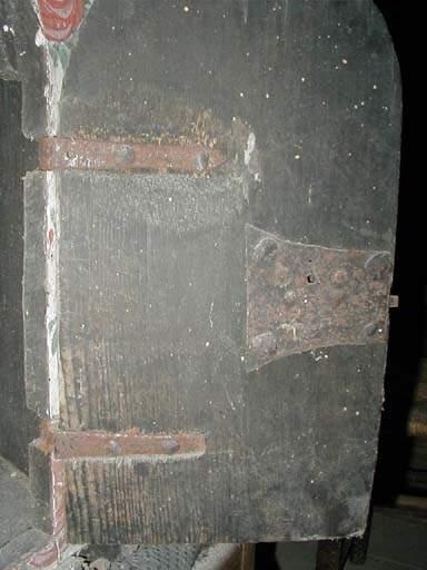 Support : bois de résineux ; assemblages par clous forgés à têtes ovales cintrées. Polychromie : peinture originale d'aspect très mat. . De forme octogonale avec face plus large.