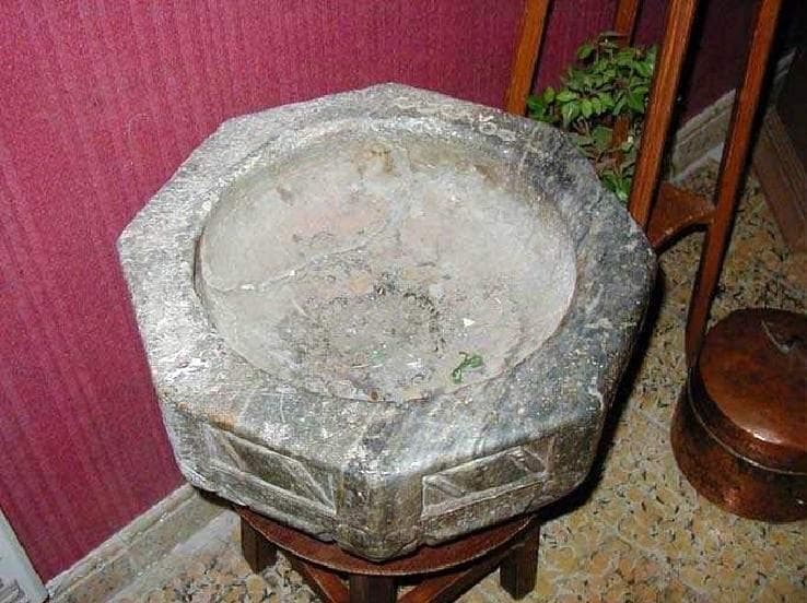 Le bénitier de forme octogonale est en marbre gris bleu assez foncé. Chaque section porte un rectangle avec deux chevrons inclinés, avec à chaque angle une tête fantastique (anthropomorphe).