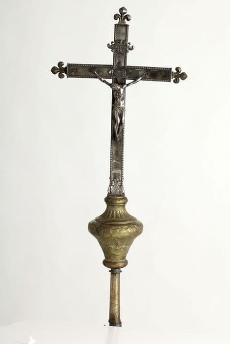 Croix latine à traverses rectilignes plates et lisses cernées en bordure d'un fin ruban d'oves séparées par de minuscules flèches. Les extrémités se terminent par des fleurs de lys fondues et rapportées. Sur la face, une figure du Christ montre un périzonium finement travaillé au mat. A la jonction de la croix, sur la face, mais également au revers, on a fixé à l'aide de clous, une fine plaque de métal découpée de festons en bordure. Au-dessus de la tête du Christ, le titulus aux formes chantournées et à décor de têtes d'angelots porte l'inscription INRI. La base de la traverse inférieure de la croix est gainée de grandes feuilles d'acanthe et prend assise sur une terrasse ornée en bordure d'un cordon d'oves. Elle se termine par un pas de vis, qui permet de fixer la croix sur la lanterne. Techniquement, la croix se compose d'une âme de bois, sur laquelle on a cloué des plaques d'argent, les fixations sont faites à froid, avec des pointes, des vis et des écrous. La lanterne se compose de deux éléments, la douille cylindrique à moulures, et le pommeau pririforme, dont le corps renflé possède un décor de médaillons chantournés habité de motifs floraux, liés entre eux de guirlandes de feuilles. La base et l'étranglement portent un décor d'oves et de godrons, tandis que le col arbore une frise d'oves. Un pas de vis placé à l'intérieur permet la fixation de la croix.