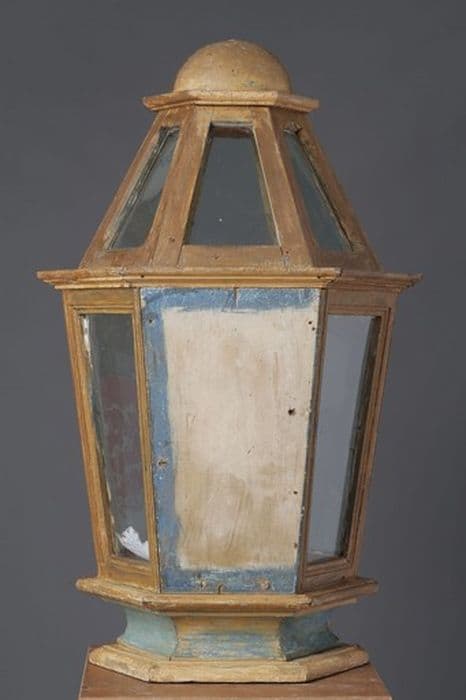 Tabernacle en forme de lanterne à six côtés reposant sur une base moulurée convexe. Le côté du revers est bouché par un panneau de bois peint à l'intérieur. Une dentelle est déposée à l'intérieur. Des restes de peinture ocre et de peinture bleue sont visibles, particulièrement au revers.