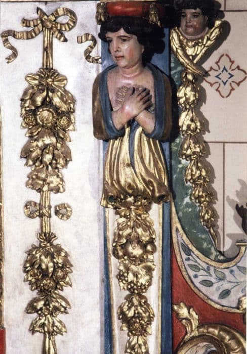 bois : taillé ; stuc : doré, peint, polychrome, décor en bas-relief, décor en ronde bosse