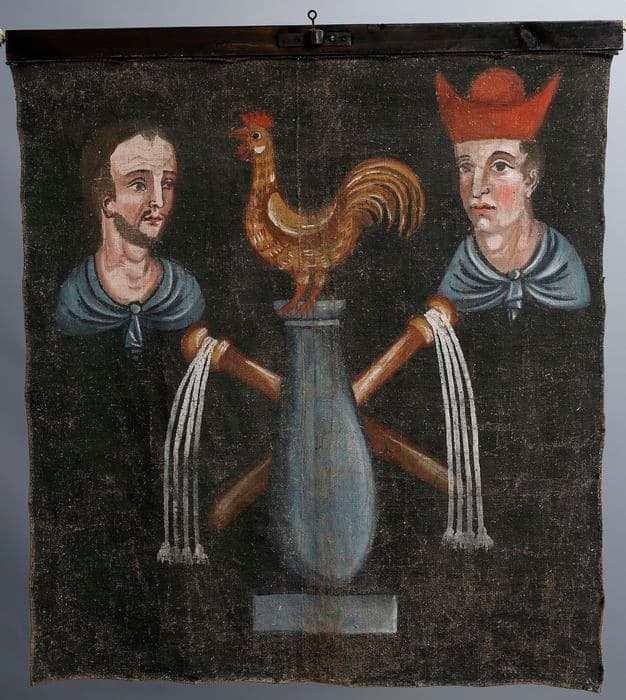 La toile est suspendue au mur de la chapelle. Elle représente deux personnages habillés de façon identique : un châle bleu est noué devant la poitrine sur leurs épaules ; ils flanquent une colonne de la flagellation sur laquelle est juché un coq ; derrière sont disposés en faisceau deux fouets. Le personnage de droite est coiffé d'un chapeau à bords pointus, rouge. Au verso, deux personnages en buste sont représentés de part et d'autre de la croix avec titulus, au-dessus le soleil et la lune, le tout sur un fond noir.