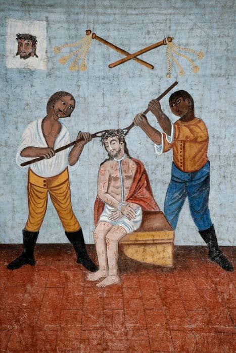 h = 354 ; la = 340 (Couronnement d'épines) ; h = 237 ; la = 274 (Crucifixion) ; h = 587 ; la = 505 (Arc triomphal)