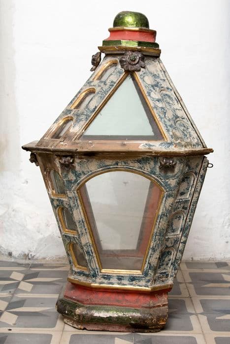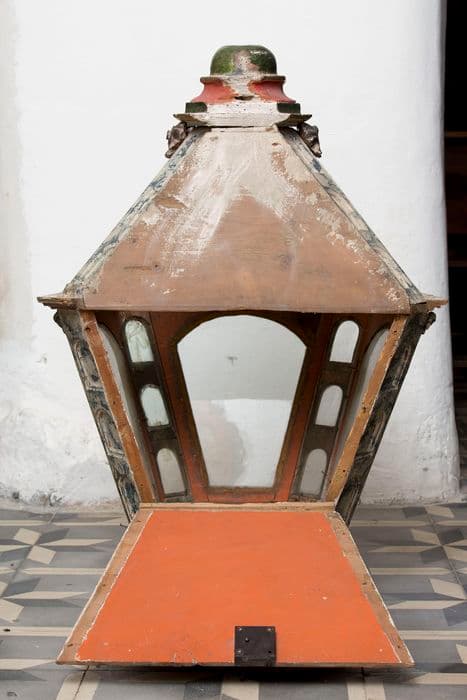 Le tabernacle est en forme de grosse lanterne, ouverture par l'arrière. Utilisé pour présenter le saint Sacrement lors de la semaine sainte. Participe au décor de monument présent dans l'édifice.
