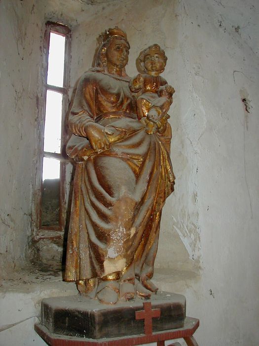 La Vierge est représentée en pied, tenant l'Enfant dans sa main gauche. Elle est couronnée et vêtue d'un manteau drapé. L'Enfant est vêtu d'une tunique, tenant dans sa main gauche le globe terrestre qui repose sur son genou gauche. Description technique : statue pleine, revers non sculpté, plat. Bois clair, tendre. L'ensemble est fixé sur la console à l'aide de deux boulons. Polychromie : dorure à la détrempe, sgraffito, décor peint sur or ; vernis postérieur, épais.