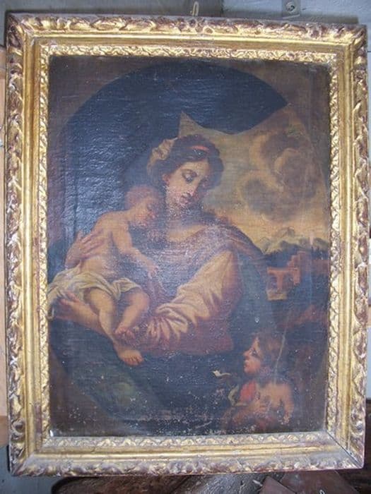 La Vierge aux cheveux bruns et bouclés tient l'Enfant des deux bras sur le côté droit. Elle est vêtue d'une robe bleue et d'un manteau rouge qui s'enroule sur son épaule gauche. L'Enfant Jésus endormi, n'est vêtu que d'un petit linge blanc autour des hanches. En bas à droite de la toile, on peut voir saint Jean-Baptiste enfant.