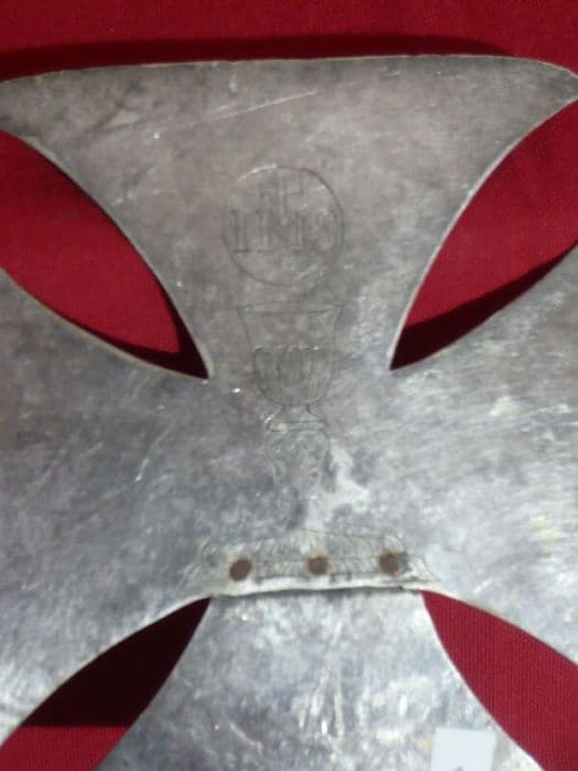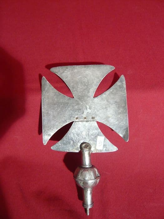 Croix montée sur une tige portant un pas de vis sur sa partie inférieure. Tige ornée d'un noeud sphérique parcouru dans sa partie médiane d'un filé mouluré, où de part et d'autre se développe un décor d'ove sur fond amati. La croix pattée est découpée dans une feuille d'argent. Sur une face est gravé un calice, style 18e siècle, surmonté d'une hostie postant les lettres IHS surmonté d'une croix. Au revers sont gravés dix figures de formes coniques, que l'on pourrait associer aux plaies du Christ.