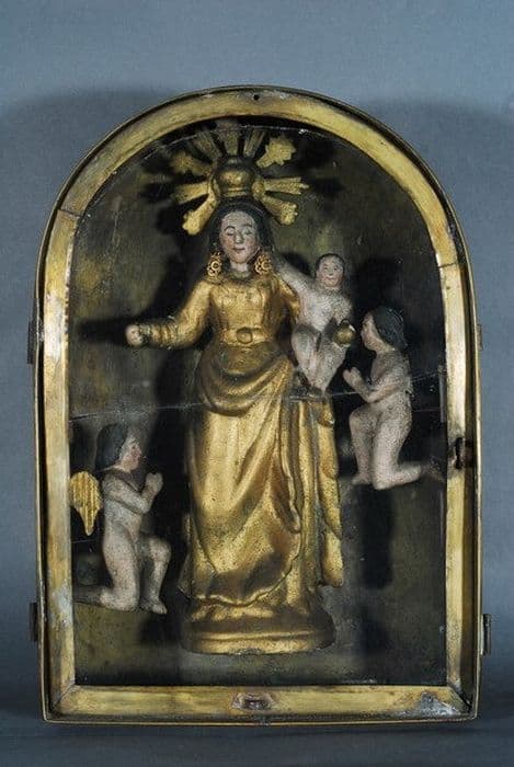 groupe sculpté : Vierge à l'Enfant et angelots dite Notre Dame du Coral, dans sa boîte dite capelleta