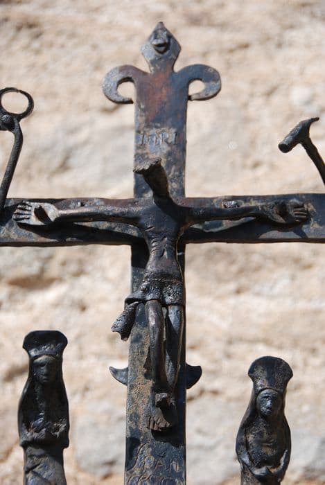 Croix fleurdelisée flanquée de deux saintes femmes, ornée de deux instruments de la Passion (tenaille et marteau), trois éléments disparus). Du côté face, le Christ en croix, côté recto : Vierge de l'Assomption. C'est une oeuvre naïve et savante à la fois et prouve l'adresse et tout le savoir faire du forgeron. Pièce rare dans les Pyrénées-Orientales, cette croix ne peut être apparentée aux croix traditionnelles des autels des défunts qu'on rencontre au centre des cimetières ni aux croix de sépultures pyrénéennes. Les diverses pièces sont serties au rivet de fer. Il n'y a aucune trace de soudures postérieures à la date de fabrication. La croix est scellée au plomb sur le socle en granit. La Vierge est couronnée et supportée par la lune, les mains jointes. Les saintes femmes sont en attitude de pleureuses et auréolées. Elles encadrent le Christ.