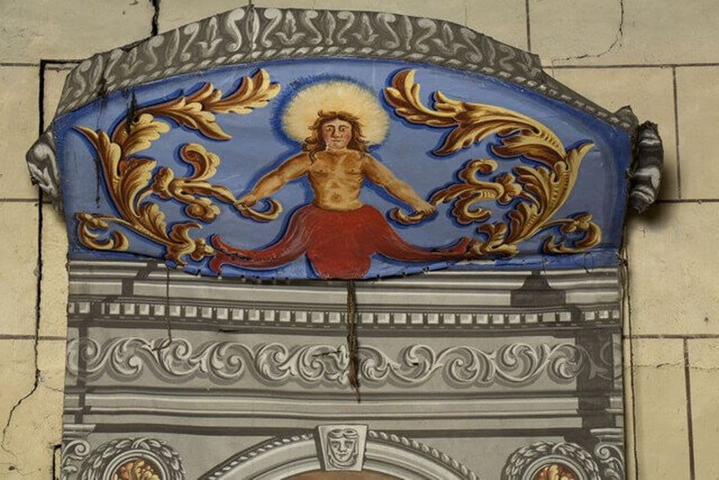 Peinture à la détremep ; bois ; carton : peint ; métal. Toile de coton tissée, fine et serrée. Support composé d'un châssis de bois non biseauté avec un système d'emmanchement prévu. Toile à une seule laie. Fronton cloué dans la partie sommitale sur la tranche. Le décor est présenté comme une toile de chevalet. Le fronton est un empiècement de toile de forme rectangulaire arrondi sur le sommet. Il vient légèrement en avant par rapport à la toile architecturée. Sur l'ensemble du tour du front, se trouve une sorte de bande de carton peint en noir et blanc et clouée. On aperçoit sur le rebord la peinture du carton (donc peint puis fixé). Polychromie : peint à même la toile, pas de préparation, peinture à l'huile très pauvre en liant (?) Châssis : tenons et mortaises, barre de renfort.