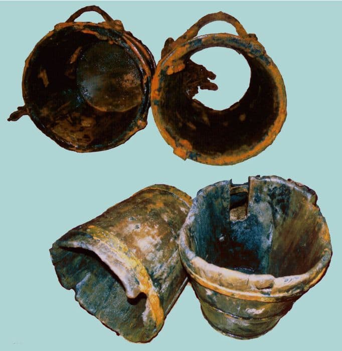 Seaux en bois à eau avec cerclages en fer, renfort latéral, encoches, de formes tronconique et de barrique. Deux de ces seaux datent probablement du XVIIe siècle et appartiennent à deux modèles différents : l'un est de modèle tronconique, l'autre en forme de barrique. Le seau tronconique a une hauteur de 65 cm, un diamètre en partie basse de 49 cm, en partie haute de 64 cm. L'épaisseur des douelles, en bois de châtaignier, est de 4 cm. Poids : une trentaine de kilos. Il est rigidifié par trois cerclages en fer avec un renfort latéral. La poignée de renversement a disparu. Ce seau montre une contenance de 80 litres. Le second seau adopte la forme d'une petite barrique : sa hauteur est de 65 cm. diamètre : 55 cm. Epaisseur des douelles (châtaignier) : 4 cm. Il est rigidifié par trois cerclages de fer, l'un d'entre eux ayant disparu. La partie haute comporte des encoches qui sont les traces de la poignée de renversement. Les deux seaux du XIXe siècle sont identiques. Ils sont en châtaignier et mesurent 65 cm de diamètre en partie haute, 42 cm en partie basse, 53 cm de haut. Poids : 40 kilos avec leurs cerclages de fer et la poignée de renversement qui, là, a survécu de même que 25 mètres de chaîne. Contenance : 103 litres.