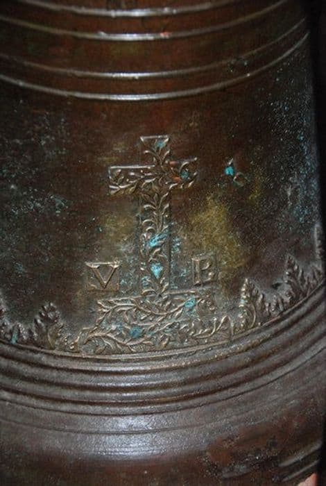 Une anse à trois trous. Nombreux entrefilets au cerveau, au bas de la panse et à la pince avec une frise annulaire à palmettes. Une croix d’ornementation à un degré avec les initiales du fondeur VB ou UV. Note : la 4.