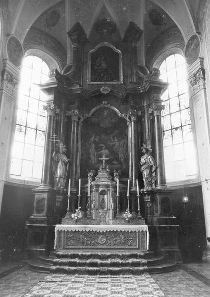 autel, gradin, tabernacle, retable, tableau : saint Cyriaque guérissant la fille de l'empereur Dioclétien, 3 statues : Vierge à l'Enfant, saint Grégoire le Grand, saint Barthélémy apôtre (maître-autel)