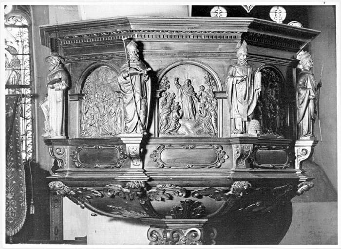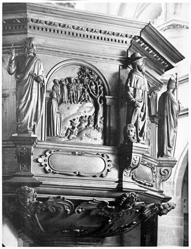 On accède à la chaire par un escalier à balustres précédé d'un portillon sculpté et daté ; un bas-relief court sur le limon. Adossé au pilier, la chaire repose sur une colonne en bois à chapiteau composite. La cuve comporte 5 pans séparés par des statues en ronde bosse et sur chaque face figure un bas-relief sous une arcade en plein-cintre. La ceinture inférieure de la cuve est ornée de cartouches aveugles à enroulements de cuirs. L'abat-voix de même plan que la cuve comporte 5 statues.
