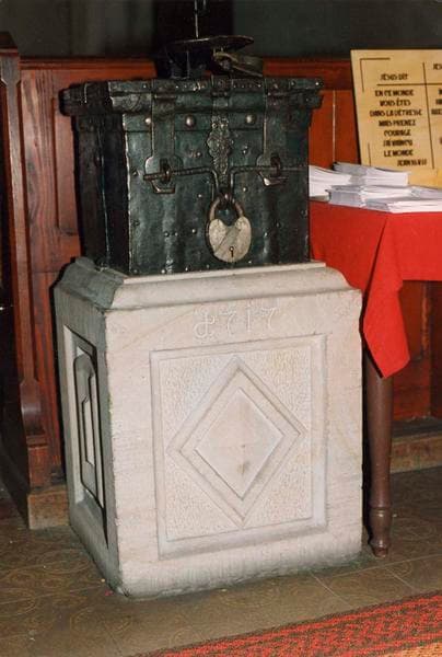 Le tronc comporte 2 parties : un socle en grès, daté 1717 sur sa face antérieure et scellé dessus, le tronc proprement dit, peut être plus ancien. Le socle a ses 3 faces sculptées de panneaux en réserve : sur la face antérieure, un losange debout formant pointe de diamant ; sur les côtés, un motif rectangulaire légèrement concave. La moulure supérieure s'accorde aux dimensions du tronc ; ce dernier est réalisé en bois bardé de plaques de métal rivetées de charnières et de motifs décoratifs.