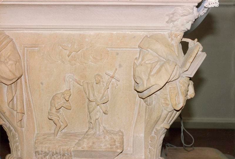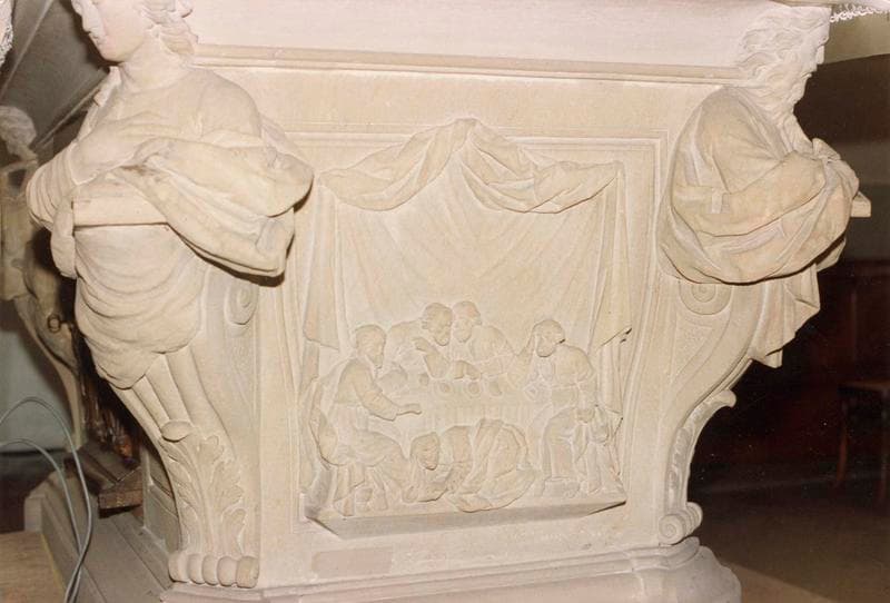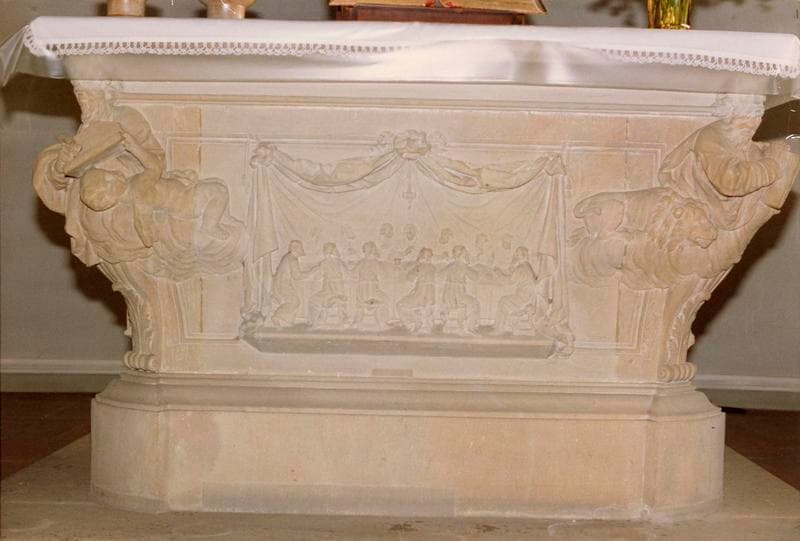 Grès de couleur jaune et grise. Table de plan rectangulaire arrondi aux angles et formant un parallélépipède régulier. Les 4 angles sont sculptés d'atlantes engainés. Trois côtés sont sculptés de bas-reliefs. Au centre de la face postérieure s'ouvre une porte en bois sculptée.