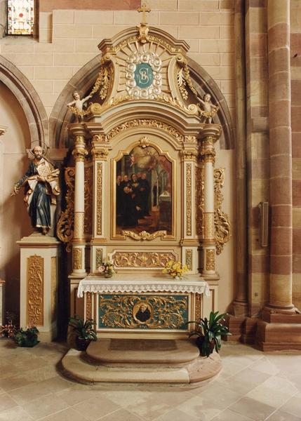 L'autel de saint Benoît est précédé de deux degrés rectangulaires arrondis en grès avec petit parquet en bois sur la deuxième marche. Le tombeau de plan rectangulaire à fond bleu du devant d'autel est occupé par une médaillon central sculpté ; autour se déroulent des rinceaux feuillagés. Le gradin du retable est orné de panneaux dorés. Le retable à panneau central s'incurve latéralement pour se terminer par deux ailes. Les parties concaves sont sculptées. Des pilastres à chapiteaux composites et ornés d'arabesques entourent le tableau. Latéralement, le fronton mouluré repose sur deux colonnes à chapiteaux composite et résille dans le tiers inférieurs. Ces colonnes se profilent devant les parties concaves du retable. Le cadre mouluré du tableau est chantourné dans ses parties supérieure et inférieure. Le couronnement du retable est formé d'un élément délimité latéralement par des volutes et terminé par une moulure cintrée. Sur l'entablement de chaque colonne, un angelot debout tient deux guirlandes de fleurs reliées au couronnement.