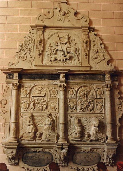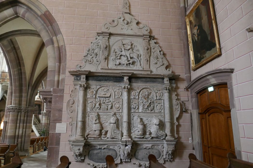 Les consoles des colonnes sont ornées de masques feuillus sur les côtés et de têtes d'angelot ailés au centre. Les deux pilastres du fronton sont ornés de têtes d'anges ailés et de chutes de fruits encadrant la scène principale. Le motif de ferronnerie des écoinçons se retrouve dans les deux ailerons triangulaires, plus ornemental et combiné à des chutes de fruits et de têtes d'anges ailés. Dans le tympan sommital, figure une tête d'ange ailé. Le relief central du fronton présente le combat de saint Georges et du dragon. Le panneau de gauche est consacré aux époux Erhard de Wangen et Adélaïde de Géroldseck, représentés à genoux en orants autour d'un heaume et devant une draperie tendue ; l'homme est habillé en chevalier ; sa tête et son visage barbu ont été mutilés, de même que l'épaule, la main et la jambe. Le relief d'Adélaïde n'a guère été touché sauf les mains tenant un chapelet. Dans la moitié supérieure du panneau, on distingue un bas-relief central sous un arc cintré, représentant l'Adoration des bergers. Le panneau de droite est consacré aux époux Hartung de Wangen de Geroldseck-ès-Vosges et à son épouse Attale de Rathsamhausen zum Stein, représentés à genoux en orants autour d'un heaume et devant une draperie tendue. L'homme est revêtu d'une armure : la moitié supérieure de son corps ainsi que les pieds ont été martelés. Dans la moitié supérieure du panneau, le bas-relief central sous arc-cintré représente la Résurrection du Christ. De chaque côté, deux cartouches superposées aux écus bûchés sont cependant identifiables par une inscription.