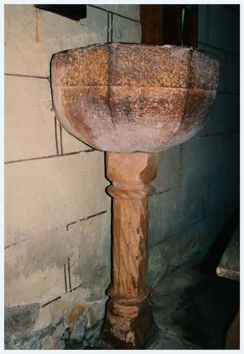 Bénitier en grès rose composé d'un pied dont le fût, juché sur une haute base, est sculpté d'un décor prismatique dans le style du gothique tardif. Ce dernier est surmonté d'un chapiteau. La cuve, de plan hexagonal, ne comporte aucun décor hormis un rebord formant bandeau dans sa partie supérieure. Elle ne possède pas de trou d'évacuation.