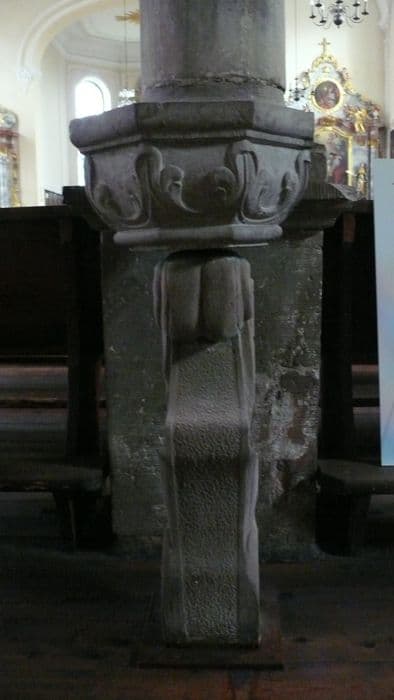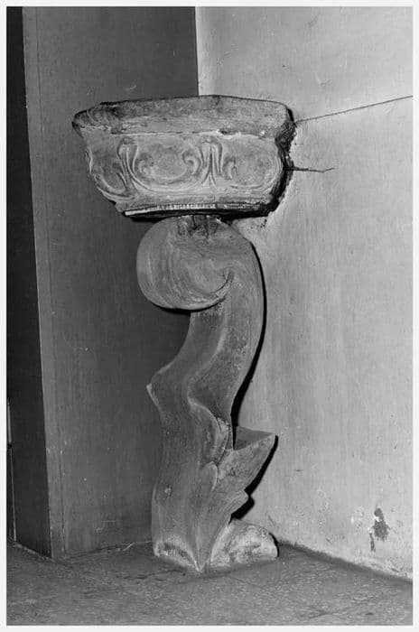 Bénitiers réalisés dans un grès gris. Le pied est une grande volute. La cuve, octogonale, est sculptée de feuilles évoquant des fleurs de lys stylisées.