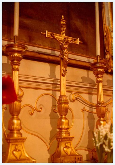 Les chandeliers, en bois, ont une tige cannelée. Les pieds, à bases triangulaires, sont ornés de coeurs ardents sur chacune des trois faces. Les croix d'autels ont le même pied. Le christ et la croix sont en métal.