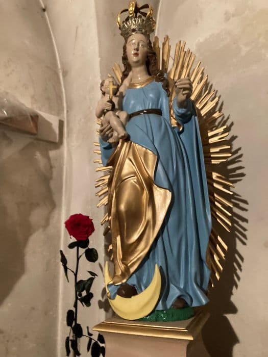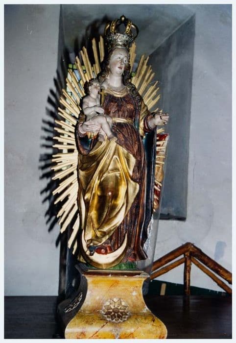 Vierge à l'Enfant ; couronne ; croix ; croissant de lune ; rayons lumineux