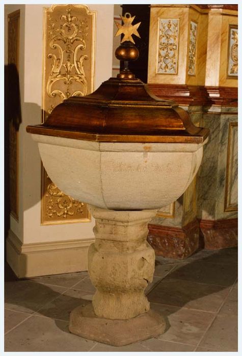 Bénitier réalisé dans un grès blanc, à base hexagonale. Le soubassement est en grès rose. Le couvercle, en bois mouluré, est en forme de dôme surmonté d'une tige avec une boule et une croix du Saint-Esprit.