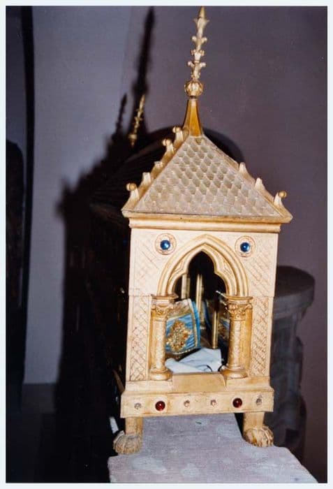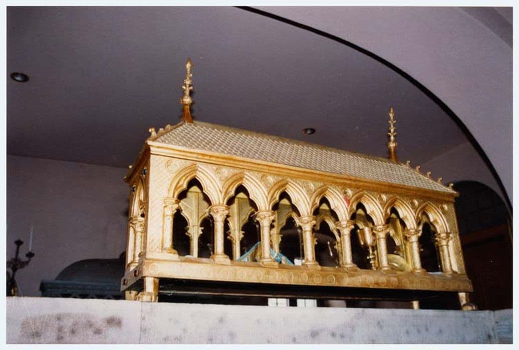 Châsse de style néo-gothique, en forme de maison, sur quatre pattes de lions. Elle s'ouvre sur un de ses grands côtés par une arcature de sept arcs brisés trilobés plus un arc sur le petit côté. Le toit, à quatre versants, simule des tuiles et s'orne de pinacles, fleurons et faîte ajourés. A l'intérieur, les reliques sont visibles dans un réceptacle ajouré de quadrilobes vitrés.
