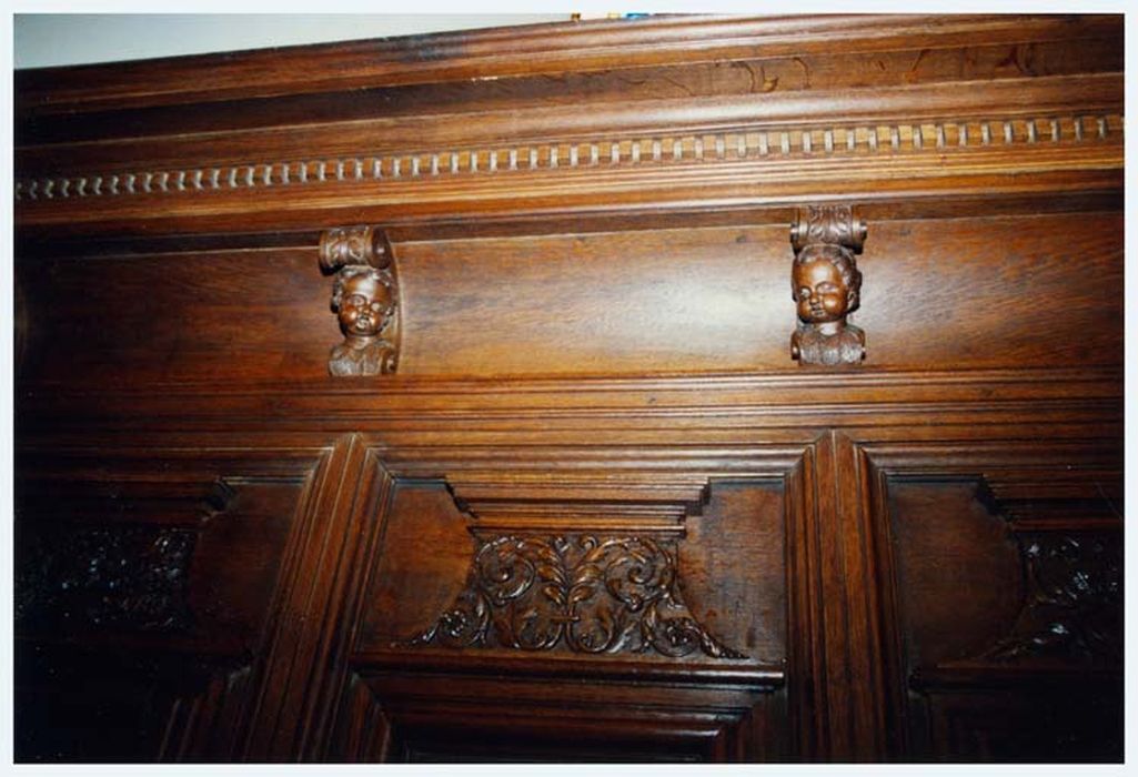 ornement à forme végétale ; cartouche ; oiseau ; colombe ; triangle ; angelot ; perle ; olive