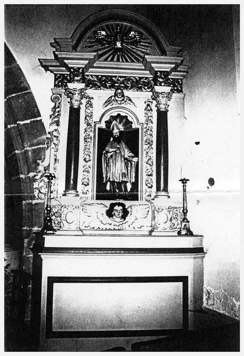 Le gradin de l'autel-tombeau porte un relief de tête d'ange ailée, des panneaux de rinceaux ornent les extrémités. Au-dessus, le retable est constitué d'une niche à coquille encadrée de chutes de fleurs et surmontée d'une tête d'angelot ailée. Cette niche abrite la statue de Saint Wolfgang, patron des bûcherons, représenté en évêque et tenant un livre dans sa main droite. Deux colonnes à chapiteaux feuillus encadrent cette niche et soutiennent un entablement à ressauts moulurés. Cet entablement est surmonté d'un fronton semi-circulaire qui délimite un tympan sur lequel figure une colombe du Saint-Esprit.