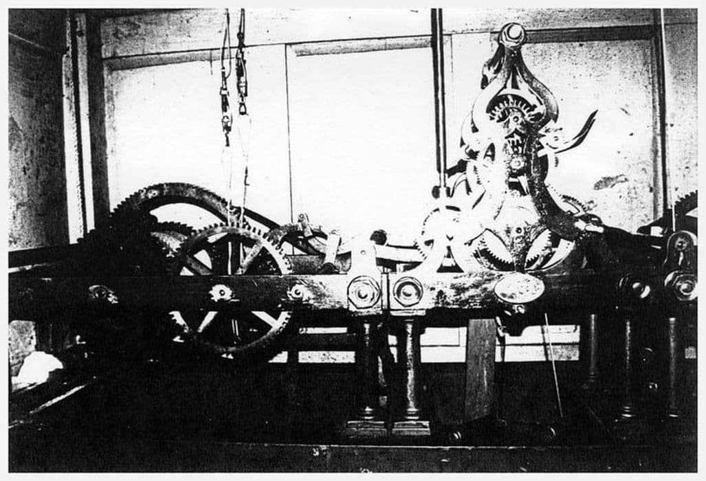 L'horloge se compose de deux bâtis parrallélépipédiques en fonte disposés de part et d'autre d'une structure centrale plus élevée à base de courbes et contrecourbes : le mouvement, formé de l'horloge et du pendule ainsi qu'un échappement au sommet. Le style de Schwilgué se reconnaît à l'emploi de colonnettes doriques pour le bâti. La structure est ici pyramidante à volutes, ce qui devient un modèle de production courante jusqu'au milieu du 20e siècle.