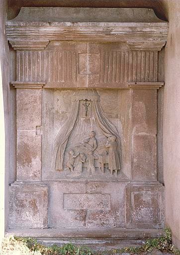 Edicule de facture néo-classique en grès rose et gris, avec un décor en bas-relief.