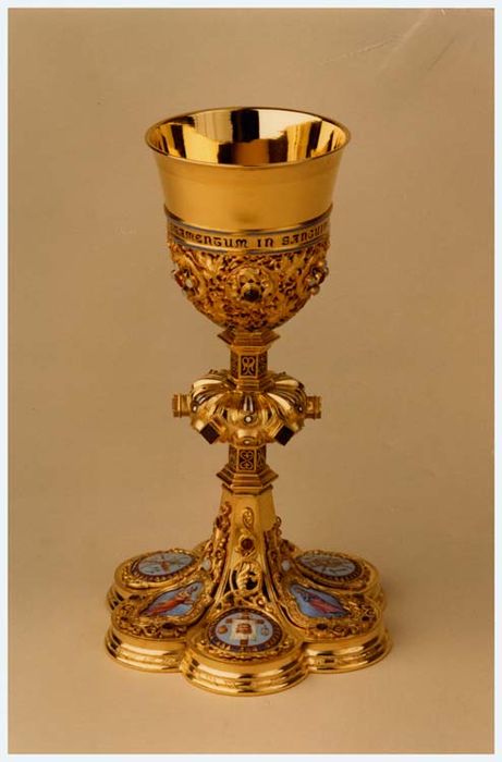 Calice néo-gothique avec pied polylobé orné de madaillons, noeud godronné avec six cabochons losangés et fausse-coupe ornée de pampres ajourés enserrant des rosaces. La coupe est unie, en forme de tulipe. Les médaillons du pied sont ornés d'émaux représentant Saint Pierre, la Sainte Face, les instruments de la Passion, la Vierge et Saint Maurice.