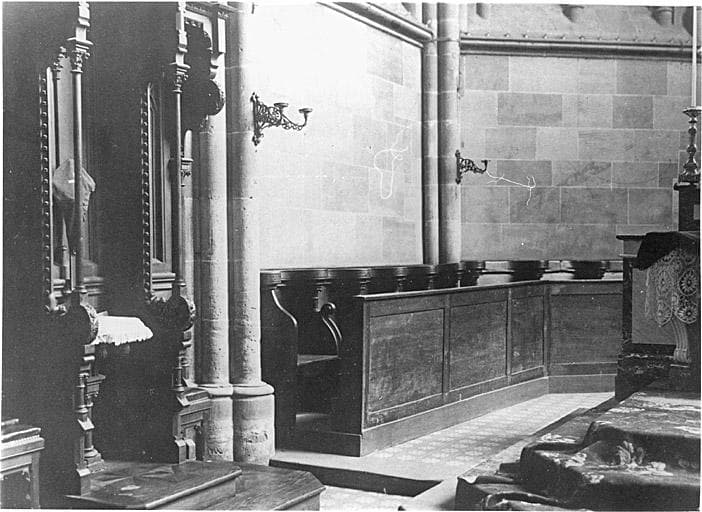 Deux séries de cinq stalles, l'une au Nord et l'autre au Sud et une série de quatre stalles au Nord-Est. Les parcloses comportent de petites colonnettes sous les sièges et sous les accotoirs. Des volutes soulignent les parcloses. On n'observe aucun décor figuré sur les miséricordes, toutes semblables. A l'Ouest des stalles subsistantes les jouées sont couronnées par une épaisse volute sculptée de feuilles de marronnier ou de lierre. L'enroulement inférieur de la volute Sud se termine par une tête humaine ceinte de feuilles d'acanthe.