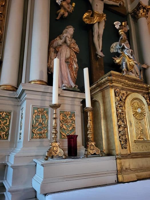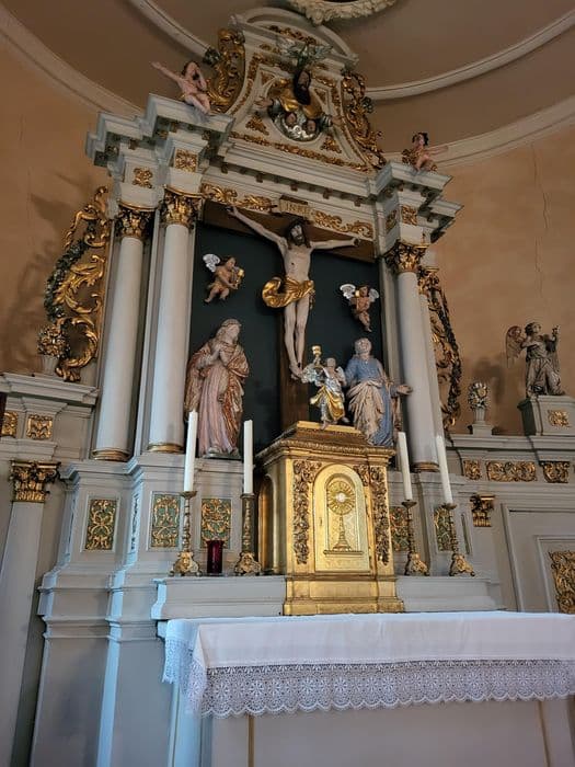 L'autel-retable a sans doute été édifié au début du 18e siècle après l'achèvement de la chapelle en 1709. La statue du Christ date du début du 16e siècle.