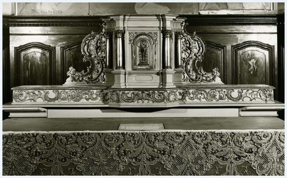 La maître-autel se compose d'un tombeau galbé et d'un tabernacle sur gradin.