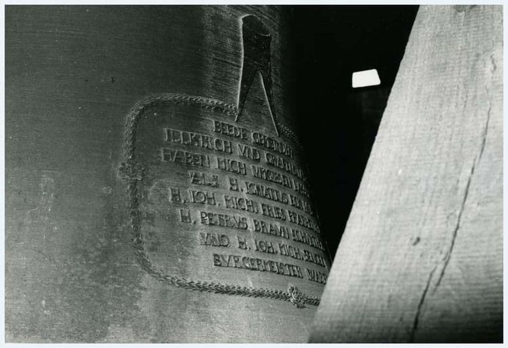 Cloche dont la note est le Sol. Elle est soulignée par une frise de roses inscrites dans des rinceaux, elle-même ourlée d'une guirlande fleurie, à glands. Sur le côté opposé à l'inscription figure un bas-relief représentant un Calvaire.
