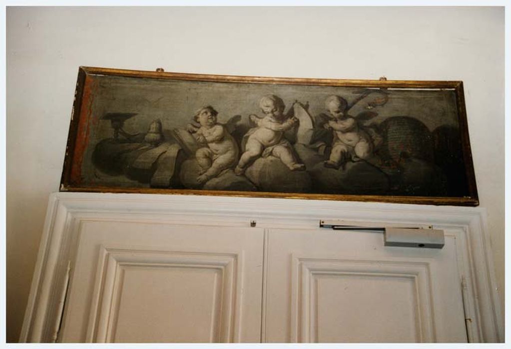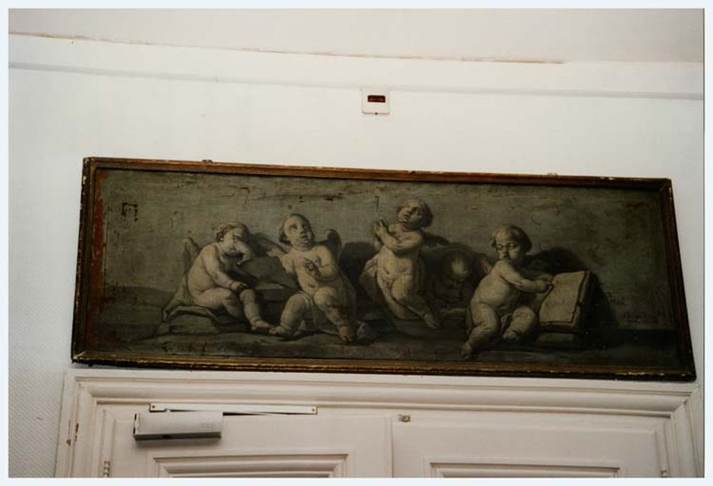 Toiles peintes en grisaille représentant, l'une, des putti avec un livre et l'abbaye au fond, et, l'autre, trois putti avec les attributs de l'abbé et une ruche évoquant la devise des bénédictins : ora et AL