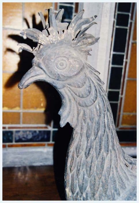 Réalisé en deux moitiés à peu près symétriques, le coq est amputé de sa base. Des traces de dorures sont encore visibles.