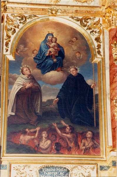 autel retable des âmes du purgatoire, 2 tableaux : Vierge à l'enfant tenant le scapulaire entre saint Odilon et saint Simon Stock, Education de la Vierge