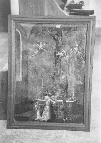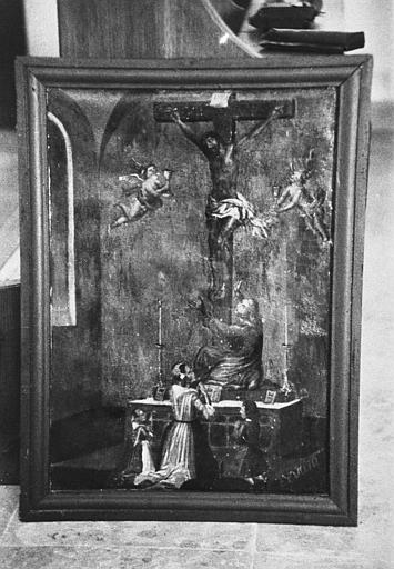POP | Plateforme ouverte du patrimoinetableau ex-voto : le Christ en croix dans une église adoré par quatre personnages et entouré de deux anges portant des ciboires