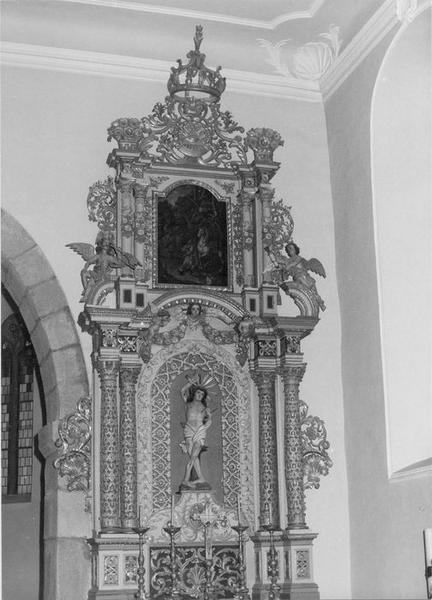 autel, retable, 3 statues, tableau : saint Sébastien, châsse de saint Hubert, putti