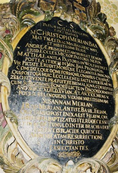 Inscription (gravée, latin) : C.S. PASTOR HUJ. ECCL. REF. GERM FIDELISSIMUS M. CHRISTOPH. MERIAN . BAS. MATTHAEI.DIAC.MIN.BAS.HEIC NATI ET MOSTISSIMI FILIUS ANDREAE PRIMUM ETIAM HUJUS. ET DEMUM EJUSD. ECCLES. MICROP. PASTORIS NEPOS MATT HAEI ANTEA PASTORIS IN WOLFSHEIM. ET. POSTE A ITIDEM IN MIN. BAS PRONEPOS, VIR PIETATE, ERUDIT MORUQUE ELEGANTIA INSIGNIS COMITATEQUE DOMITORISQUE OMNIBUS CHARUS ; QUI POSTQUA HUIC ECCLES. EHEU. SALTEMPER IX MENS. ZELOFERVENTE PRAEFUIT FEBRIMALIGNA CORREPTUS CUM SUMOOMNIU BONORU LUCTUIN DNOOBDORMIVIT. ANO MDCCCXLIII.D.XV IAN.AET.AN.XXX.MENS.V. POSTSE (?) RELIQUENS VIDUAM MOSTISSIMAM SUSANNAM MERIAN J.ROD MERIANI, ANTIST. BASIL. FILIAM. QUAE BIDUOPOST ENIXAEST FILIUM, QUI CHRISTOPH. BAPTIZATUSITERUDECESSIT, ET IN ? ODE TUMULOINTER BRACHIA DEF. PARENTIS PLACIDE QUESCIT. AMBOBEATAM RESURRECTIONE IN CHRISTO EXSPECTANTES.