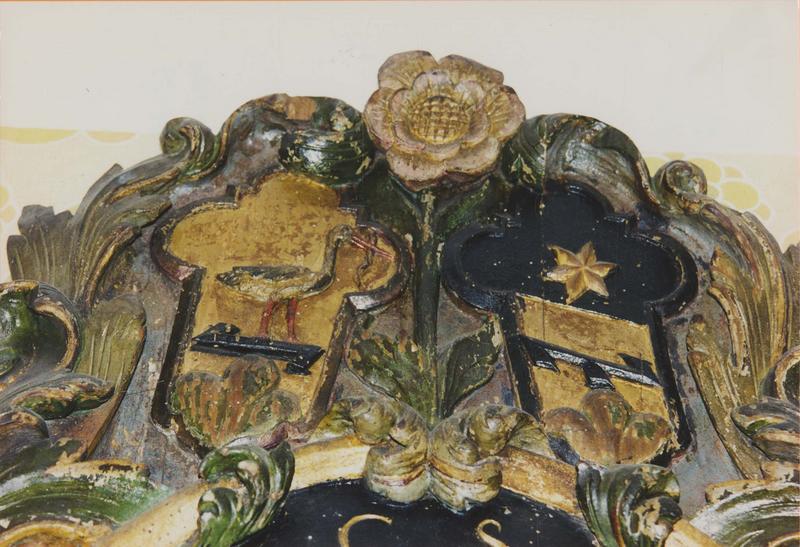 Haut de près d'un mètre quarante, le tableau affecte une forme ovale surmonté d'un couronnement incluant des armoiries incluse chacune dans un cartouche trilobé. Peint en noir et légèrement bombé, le champ du cartouche porte une inscription gravée et dorée.
