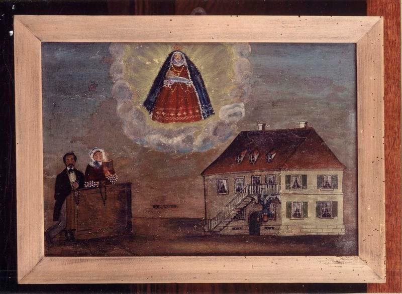 POP | Plateforme ouverte du patrimoinetableau ex-voto : Vierge de Pitié, homme tombant d'un balcon d'une maison, couple à genoux avec chapelet