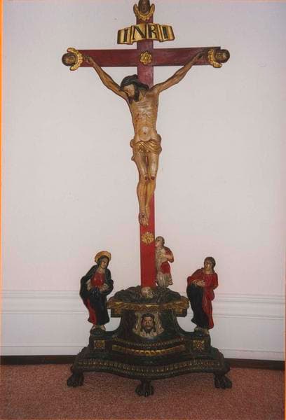 Du point de vue de la typologie, cette oeuvre est vraisemblablement à rapprocher d'une croix d'autel. Son originalité réside dans le fait qu'au pied de la croix, sont représentés la Vierge et saint Jean, ainsi qu'une Sainte-Face. La polychromie est entièrement d'origine, et cette pièce se trouve dans un très bon état de conservation.
