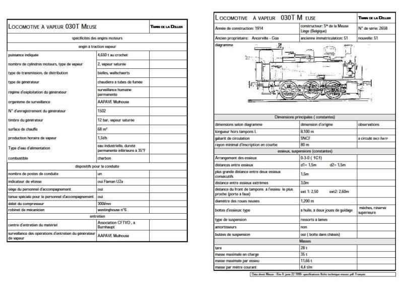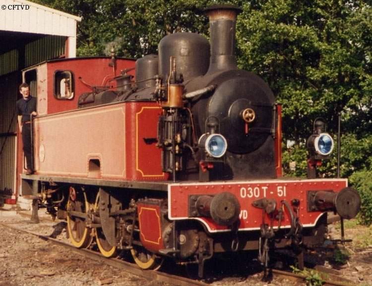 La CFS-NE (Compagnie des Chemins de Fer Secondaires du Nord-Est) est née en 1922 de la fusion de deux Chemins de Fer : la CF Saint-Quentin à Guise (Compagnie du Chemin de Fer de Saint-Quentin à Guise) créée le 18 janvier 1869 et la CDA. (Compagnie des Chemins de Fer Départementaux de l'Aisne) créée en 1905. La CFS-NE, en 1956 verra l'arrivée en son sein de la CFIL du NF (Compagnie des Chemins de Fer d'intérêt local du Nord de la France) crée en 1900 ; celle-ci avait à sa création repris la compagnie du CF de Guise au Cartelet créée en 1898. Le 29 février 1960, la CFS-NE fusionne avec sa filiale la CFS (le siège social et les administrateurs des deux compagnies étant les mêmes).£En 1908, la firme liégeoise La Meuse a livré au Nord-Est la 030 T 5, suivie en 1913 d'une autre à peu près identique (n° 6) et en 1914, d'une troisième, à peine différente mais un peu plus lourde, numérotée 51. La 030 T n°51, affectée sur Saint-Quentin - Guise sur le réseau des CFS-NE dans l'Aisne, s'est avérée excellente à l'usage. Aussi, entre 1921 et 1923, le Nord-Est fit-il reproduire ce modèle à 17 exemplaires numérotés de 52 à 68. Ces machines étaient identiques à la 51, hormis la paroi arrière de l'abri plane sur la 51, alors que le bas était incliné sur le reste de la série (52 à 68), de façon à faciliter le maniement des outils à feu, toutes étant munies de l'élégant chapiteau de cheminée en laiton poli, signature de la Meuse. Avec ses 18 locomotives, le Nord-Est disposait d'un parc homogène, simple, puissant et économique d'entretien. Elles étaient remarquablement bien équilibrées, ce qui leur a assuré une très bonne tenue de voie pour des 030. Cette locomotive à vapeur de La Meuse était, pour une machine sans prétention, si réussie que dans les années cinquante, au moins 166 locomotives semblables existaient, réparties dans toute la France en service sur des compagnies privées ou sur des réseaux industriels.£Le Nord-Est a affecté en son centre de Rambervillers (Vosges), les machines n° 51, 52 et 57. Elles prirent en charge une partie du service marchandises entre Rambervillers, Mont-sur-Meurthe et le triage de Blainville, ainsi que le trafic mixte entre Rambervillers et Bruyères. A partir de 1935, l'une d'entre elles allait périodiquement par ses propres moyens, mais avec un pilote Est, à Raon-l'Etape sur la ligne de Lunéville à Saint-Dié ; le Nord-Est ayant en 1935 reçu l'affermage de la ligne à voie métrique de Raon-l'Etape à Raon-sur-Plaine au trafic marchandises très important, devait en effet assurer l'exploitation de l'embranchement à voie normale reliant Raon-l'Etape Est à Raon-Transit, en contournant la ville. Sur le parcours SNCF Mont-sur-Meurthe - Blainville, où les déclivités ne dépassaient pas 4 mm/m, les Meuse étaient autorisées à prendre 700 tonnes contre 300 tonnes de Mont-sur-Meurthe à Rambervillers et Brouvelieures (rampes de 13 à 14,5 mm/m) et 120 tonnes de Brouvelieures à Bruyères avec la rampe de Belmont de près de 20 mm/m (l'une des plus forte de l'Est). Les parcours sur la ligne Paris - Strasbourg, avaient imposé l'installation d'un indicateur-enregistreur Flaman, déposé par la suite, du moins sur la 51.£Les 52 et 57 repartirent dans l'Aisne en 1943-1944, tandis que la 51 était mutée à Provins où elle a tracté avec panache et énergie des navettes voyageurs Longueville - Provins, preuve de sa stabilité. La 030 n° 51 quitta la Seine-et-Marne pour rejoindre en Meuse la ligne du Güe - Ménaucourt (GM), jusqu'à sa disparition le 31 décembre 1969, puis dans le même département le chemin de fer de Robert-Espagne à Haironville, où sa carrière commerciale pris fin le 31 décembre 1971 avec la fermeture de cette petite ligne. La 030 Meuse n° 51 est alors rachetée par le CFTVD (Chemin de fer touristique de la vallée de la Doller), aujourd'hui TTDA (Train Thur Doller Alsace), où elle reprend une activité à des fins muséographiques et touristiques ; elle est d'ailleurs la première des locomotives à vapeur remise en service par l'association.£ Ce matériel est l'unique représentante en activité des locomotives de la Compagnie des Chemins de fer Secondaires du Nord-Est, importante compagnie de transport départementale ; de plus, au détour des années trente, elle a circulé sur les lignes des grands réseaux reçues en affermage. Cette machine de caractère plutôt industriel avait pourtant la particularité de tracter des trains omnibus de voyageurs. Cette locomotive est un matériel classique devenu suffisamment rare pour que sa préservation soit aujourd'hui justifiée.£Propriété de l'association Train Thur Doller Alsace.