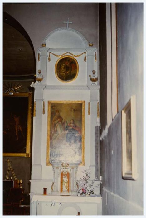 Autel-tombeau surmonté d'un retable constitué de deux pilastres lisses encadrant un panneau central contenant une toile. Ces pilastres soutiennent un entablement orné de denticules et sont surmontés de pots à feu. Au niveau supérieur la même élévation est répétée, ornée en son centre d'une toile en médaillon, le tout étant couronné par un fronton semi-circulaire lisse.